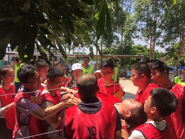 經(jīng)過短暫的午休后,團(tuán)隊(duì)進(jìn)入了第四個項(xiàng)目“同心鼓”,一人墜球,其他人握繩顛球,領(lǐng)先完成20個顛球的隊(duì)伍為勝。從一開始的手忙腳亂,在游戲過程中不斷取長補(bǔ)短,團(tuán)結(jié)合作,到最后步驟一致,共同為了完成目標(biāo)而努力。所有成員在團(tuán)隊(duì)中找到自己的價值,發(fā)揮自己的作用,同時也學(xué)會聆聽他人,配合他人,關(guān)愛他人。